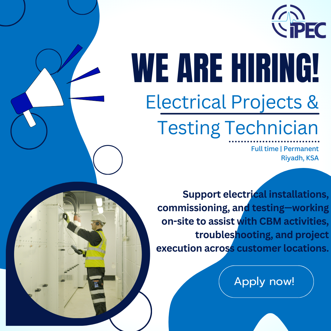IPEC is seeking a skilled Electrical Projects & Testing Technician to support project execution and electrical testing activities across customer sites in Saudi Arabia.